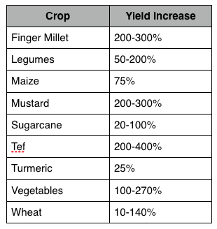 - 65% increase for lentils (black gram), up from 850 kg/ha to 1.4 tons/ha;